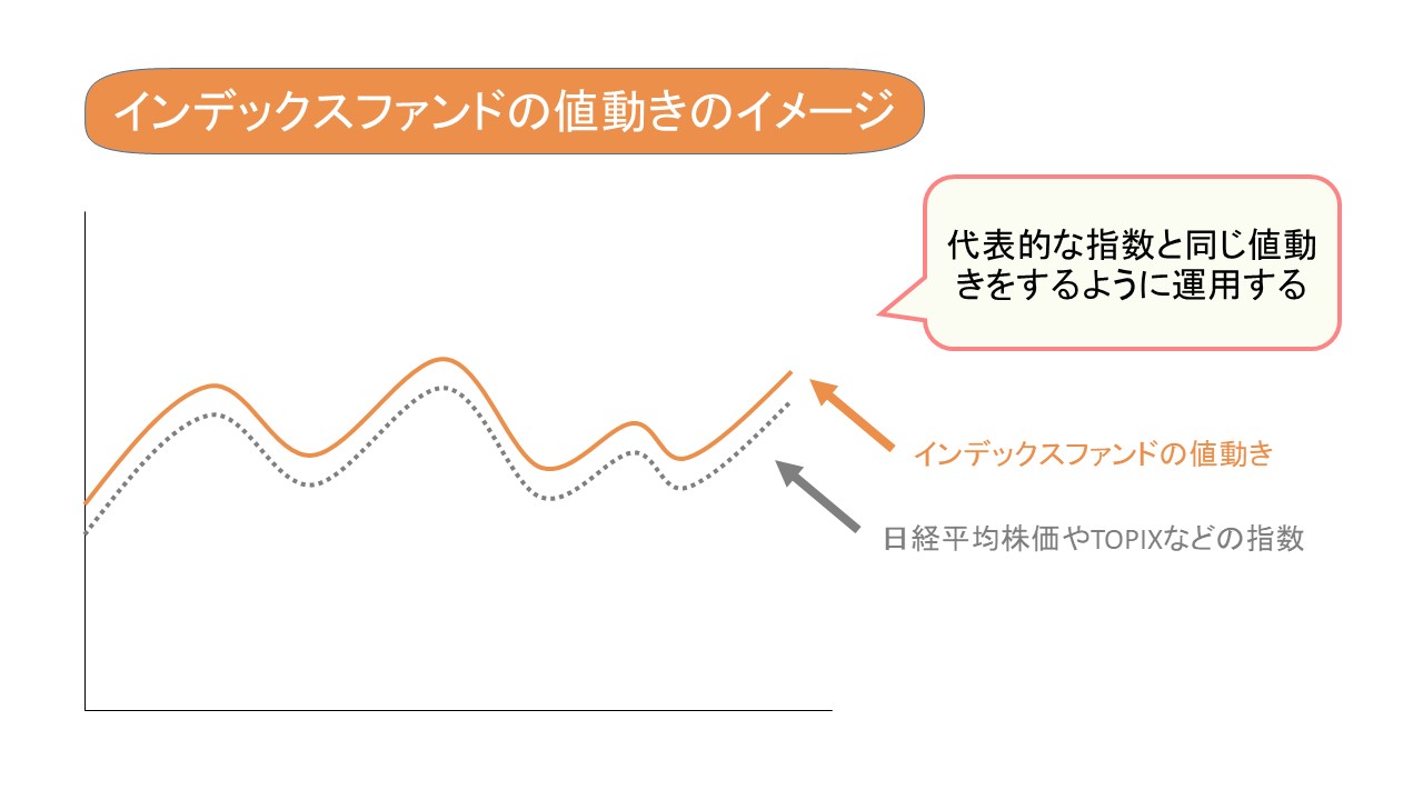 インデックスファンドとは、あらかじめ決められた日経平均株価やTOPIXなどの指数と同じ値動きを目指して運用される投資信託のことをいいます。