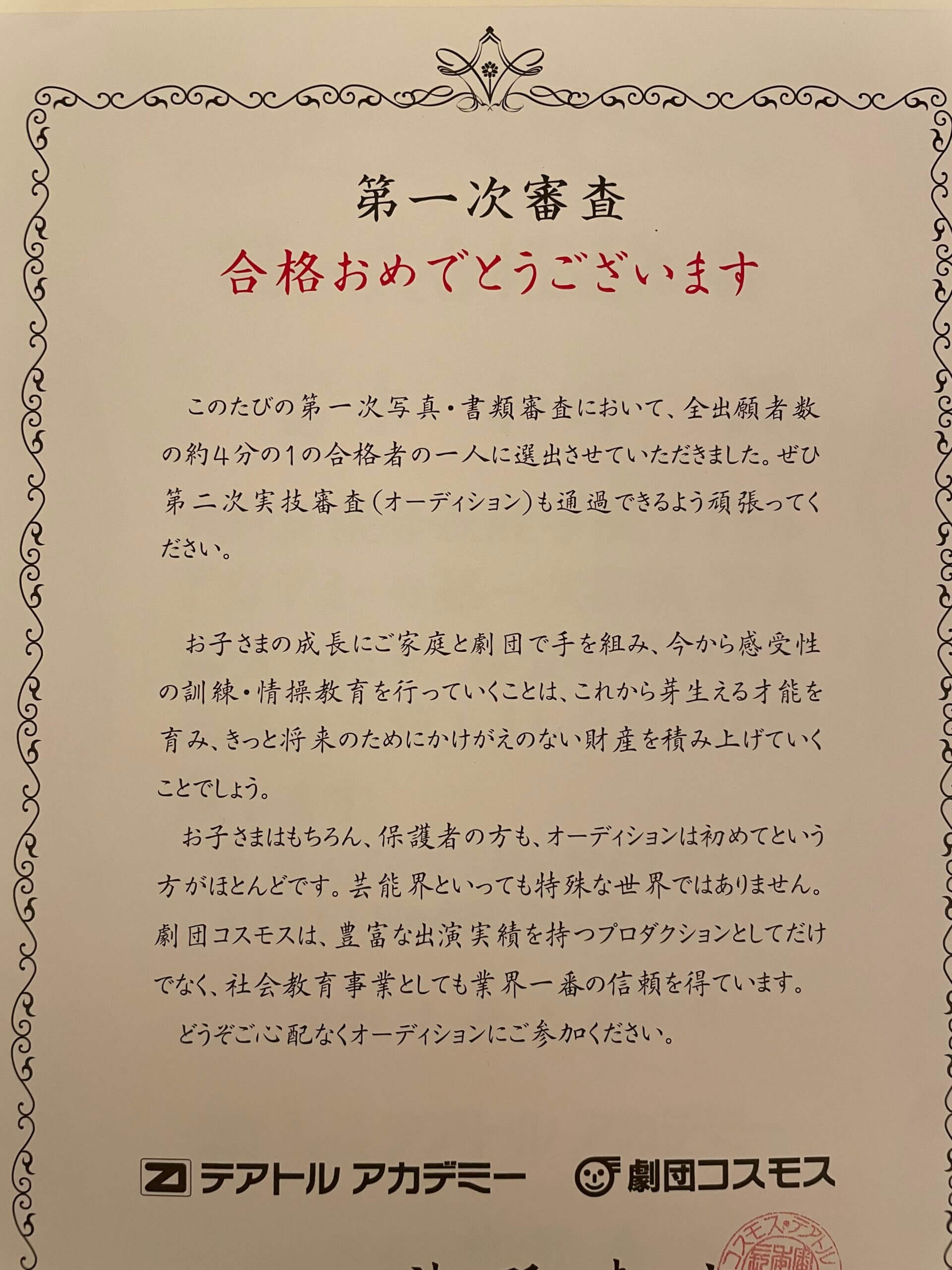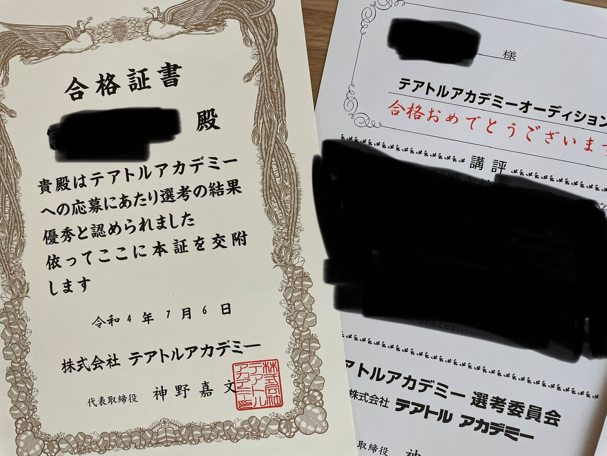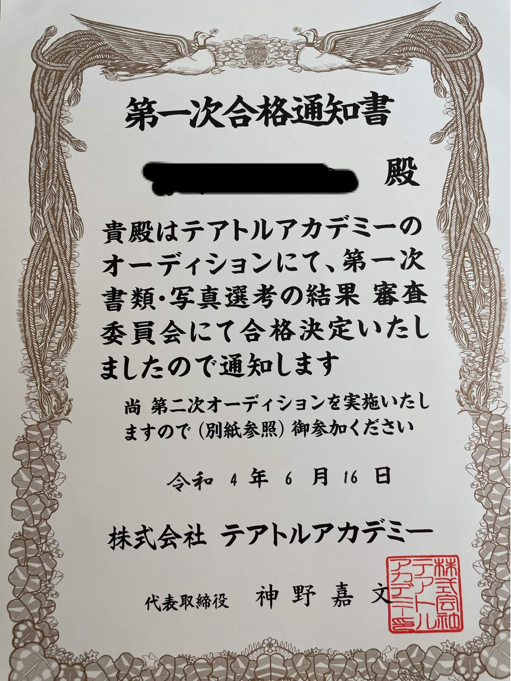 テアトルアカデミーの二次審査に合格すると、合格証と好評が届き、テアトルアカデミーから電話がかかってきます。